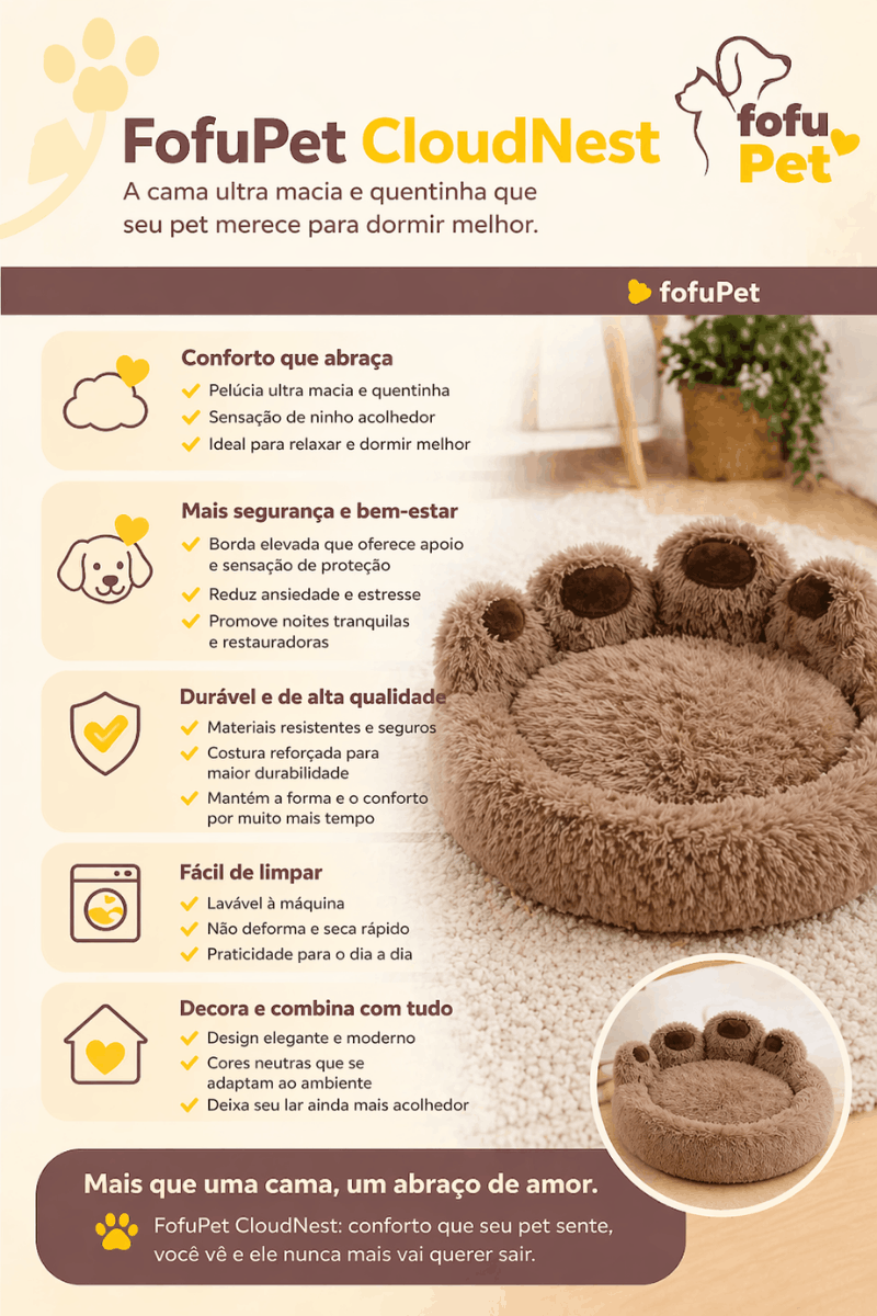 A FofuPet CloudNest™ foi criada para proporcionar um descanso profundo, seguro e extremamente confortável.